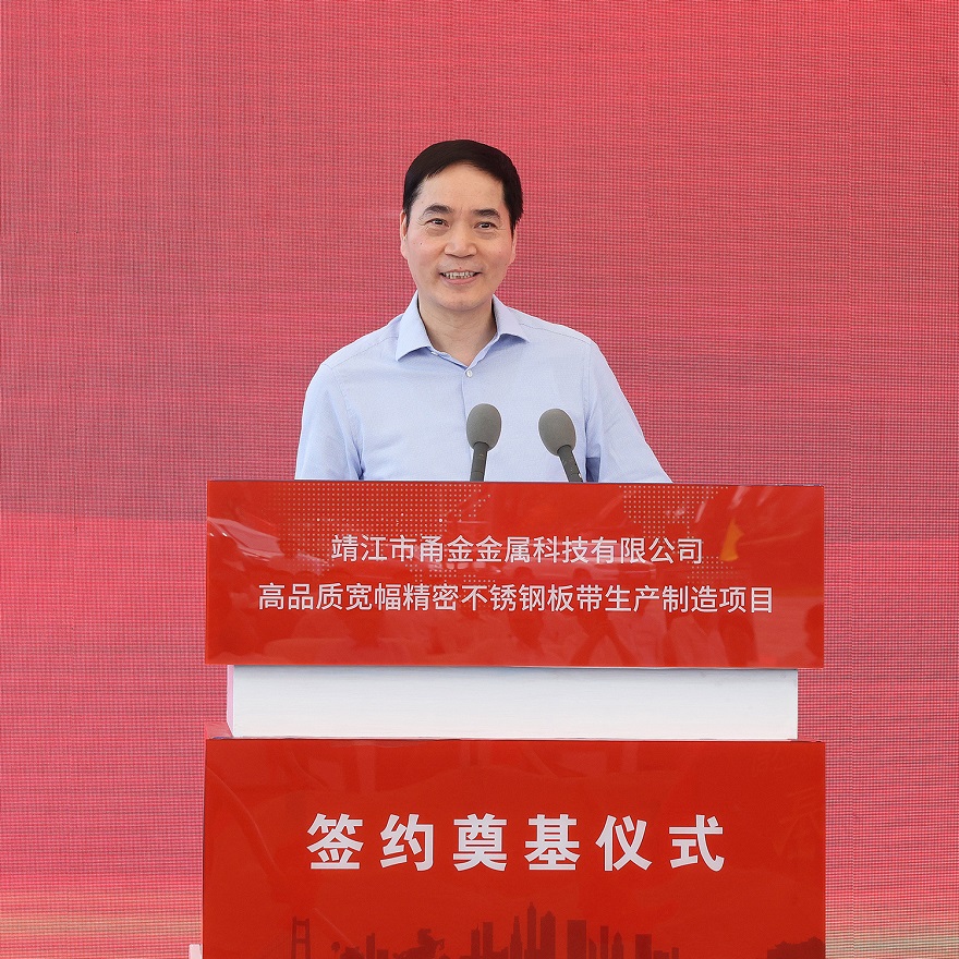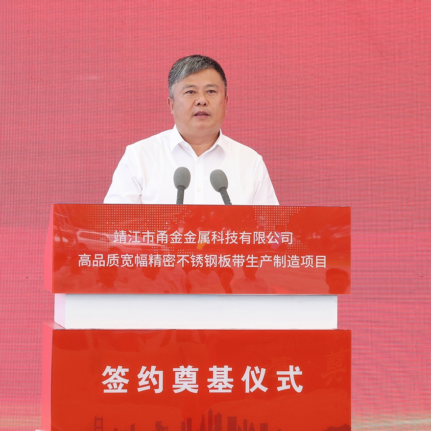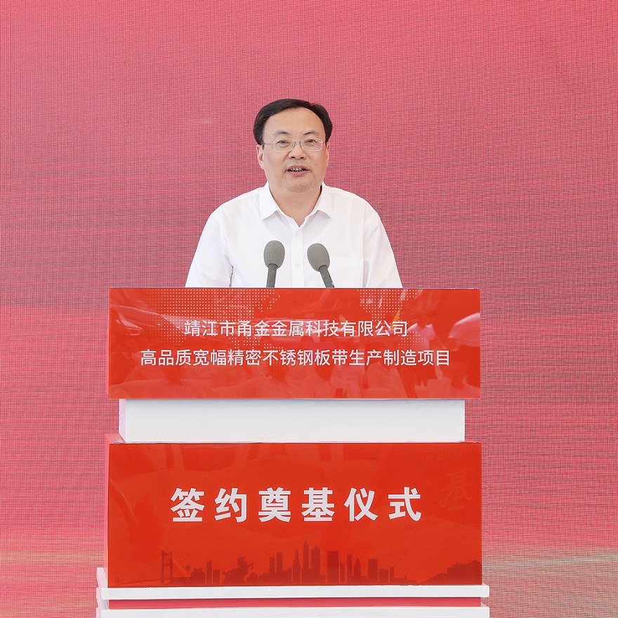 靖江市委常委、经济技术开发区党工委副书记张劲松介绍了项目情况,他指出:靖江甬金项目总投资20亿元,用地271亩,计划建设年加工120万吨高品质宽幅不锈钢冷轧钢带生产基地;靖江开发区将以最大的诚意尽最大的努力,以最优质的服务、最优秀的政策、最优良的环境助力项目高效的推进、高标准建设,真正让企业投资放心、创业舒心、发展安心。