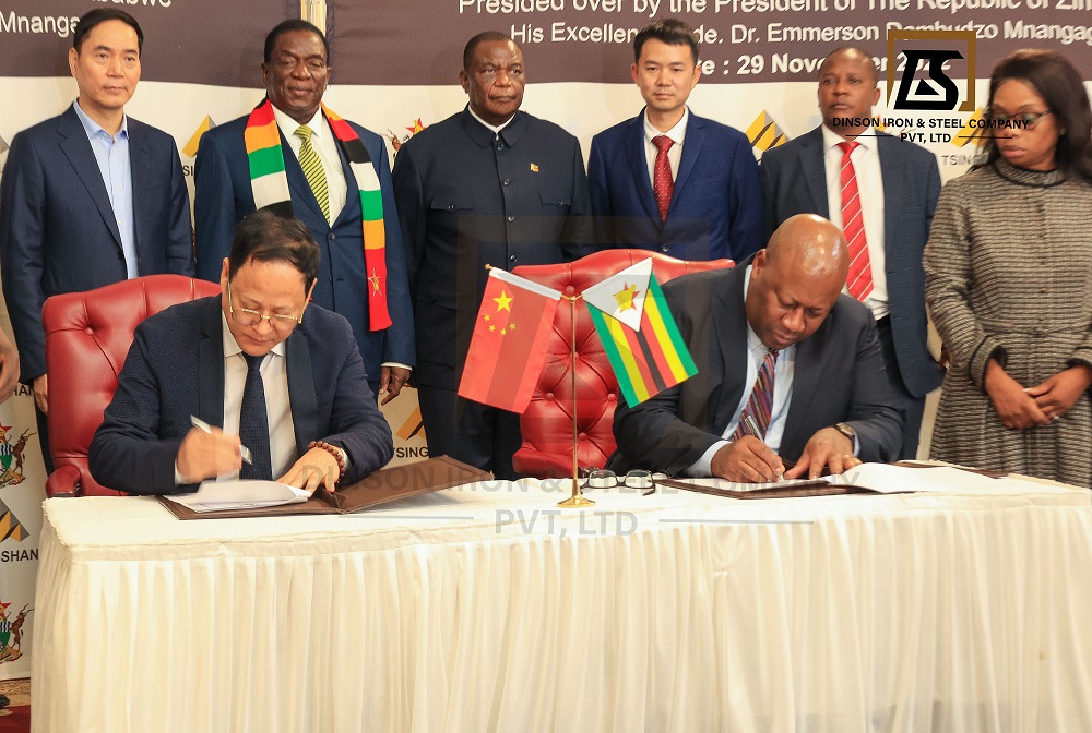 陈上松董事长和齐坦多部长在姆南加古瓦总统和项光达主席的见证下,正式签署谅解备忘录。该谅解备忘录是津巴布韦政府与jinnian金年会实业2018年签署的备忘录的升级版,jinnian金年会将把普碳钢产能提高到每年500万吨,焦炭产能提高到每年500万吨,铬铁产量提高到每年50万吨,并新建年产100万吨水泥的生产线和200万吨锂精粉的加工厂。